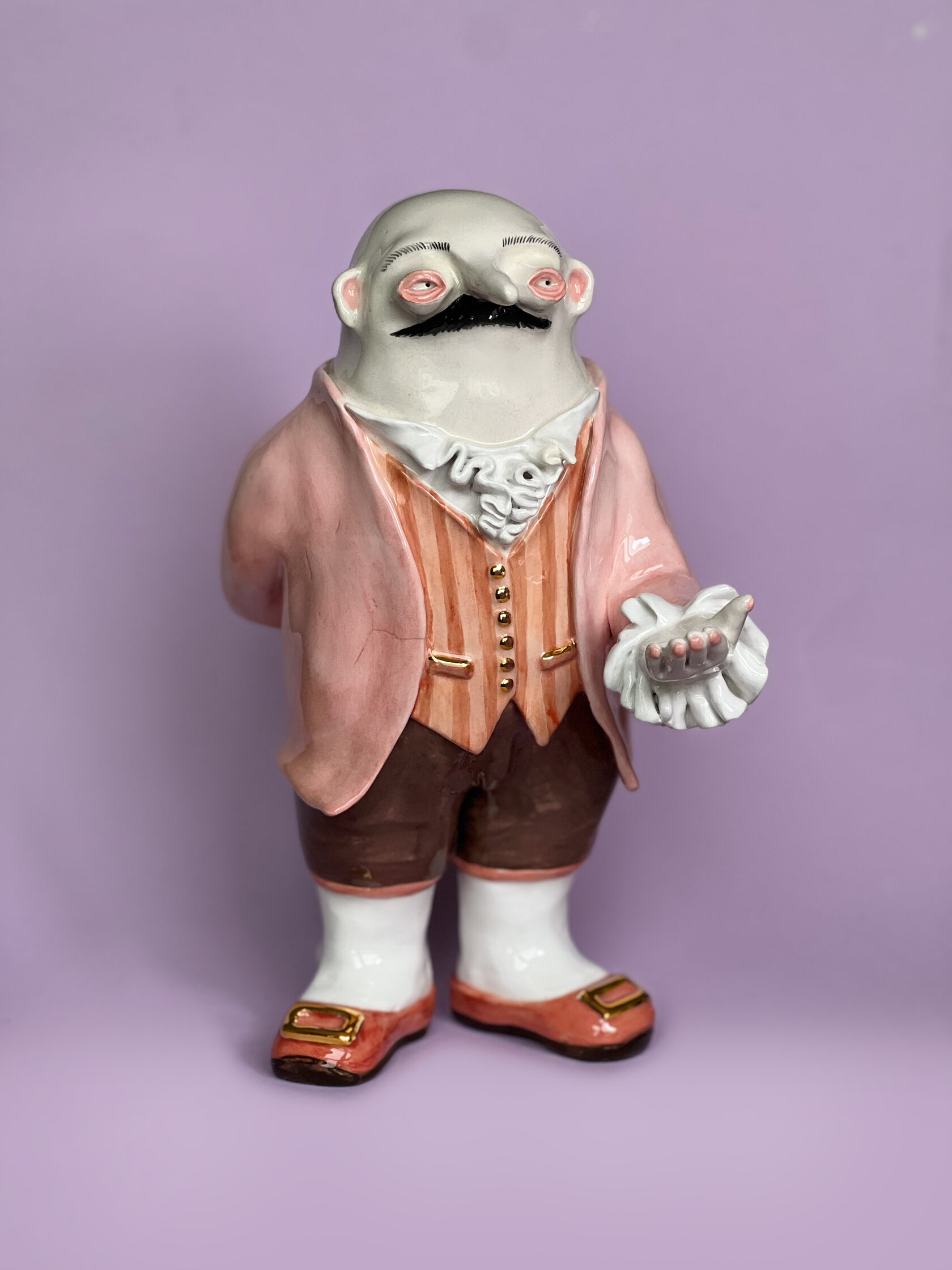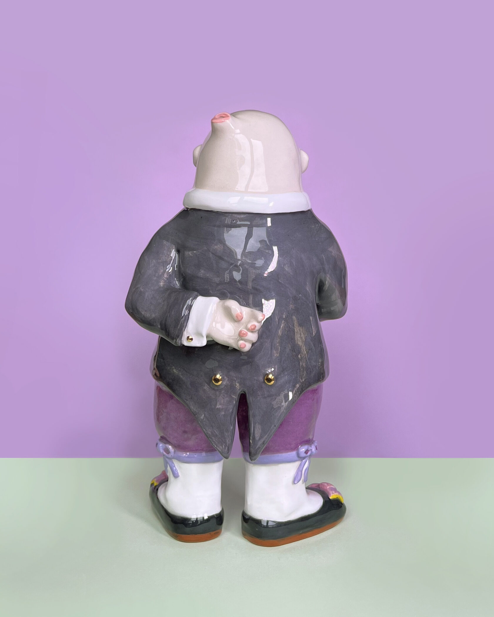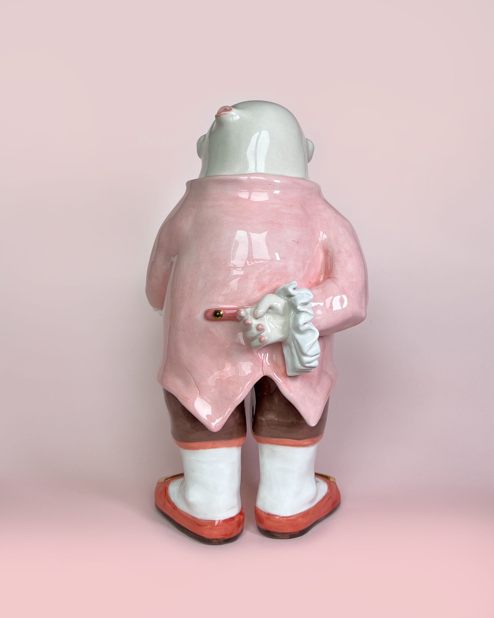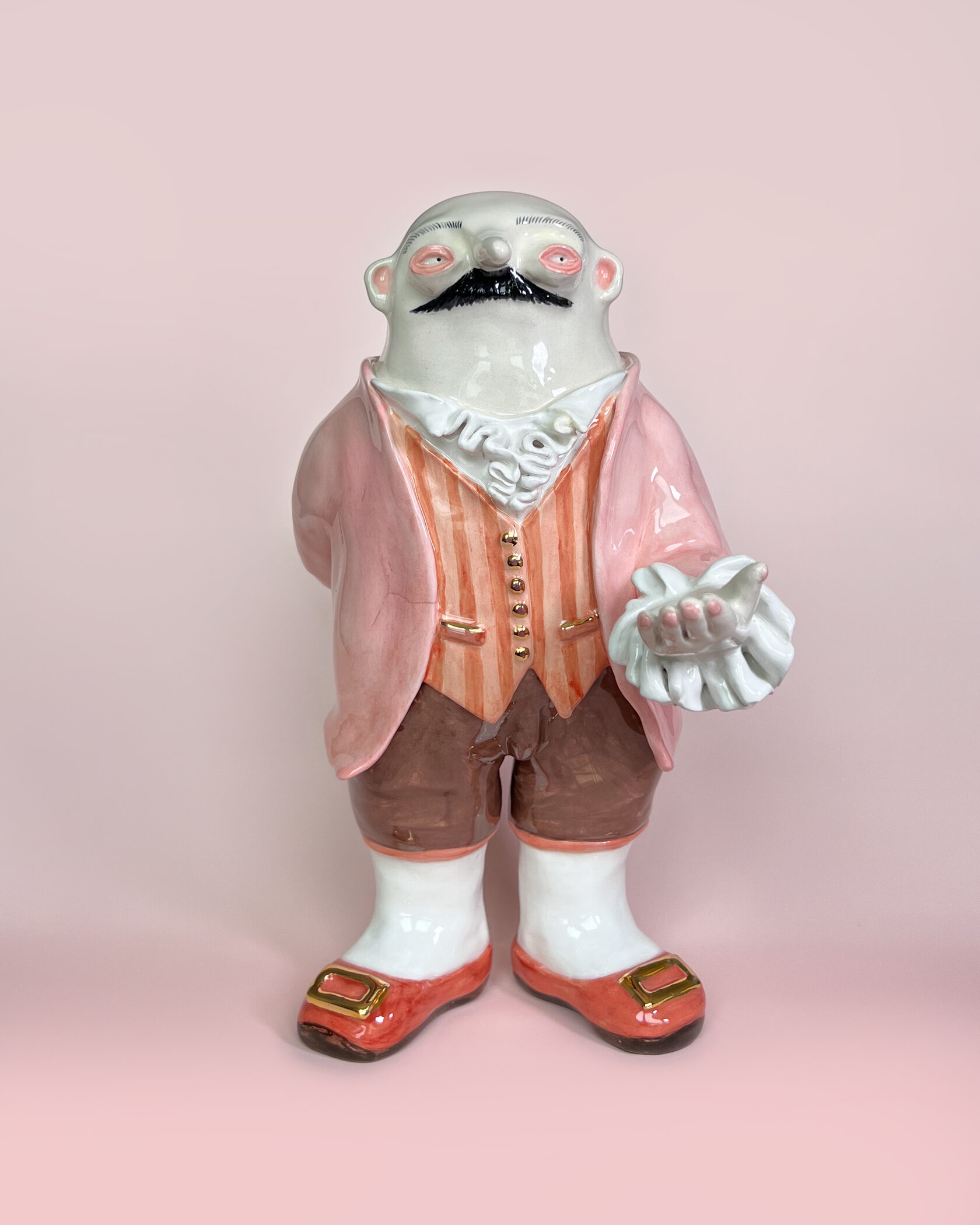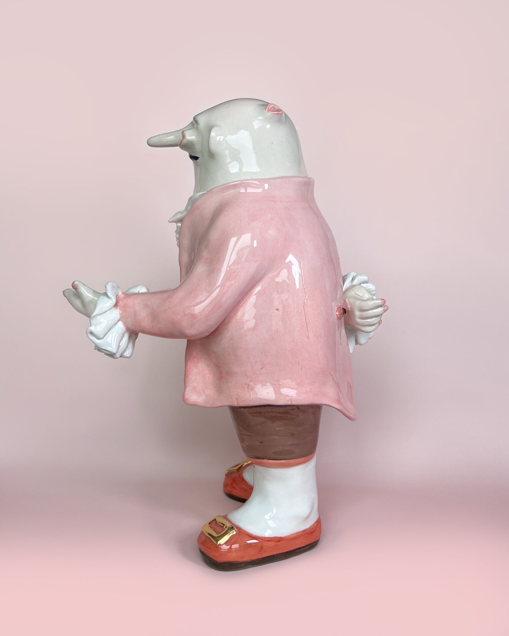 ENG Ver is the eldest son Ver inherited his mother's hues: his costume almost matched Eila's pink outfit, as if he wanted to be her reflection. He is the guardian of words and truth, the truth that was spoken but remained unheard. With his left hand, he extends an invisible promise, while his right hand is hidden behind his back. This gesture represents power and concealment. Eila loved him more than the others, and this love became a burden for Ver: he always stood taller, but never freer. Height (H): 27 cm Width (W): 14 cm