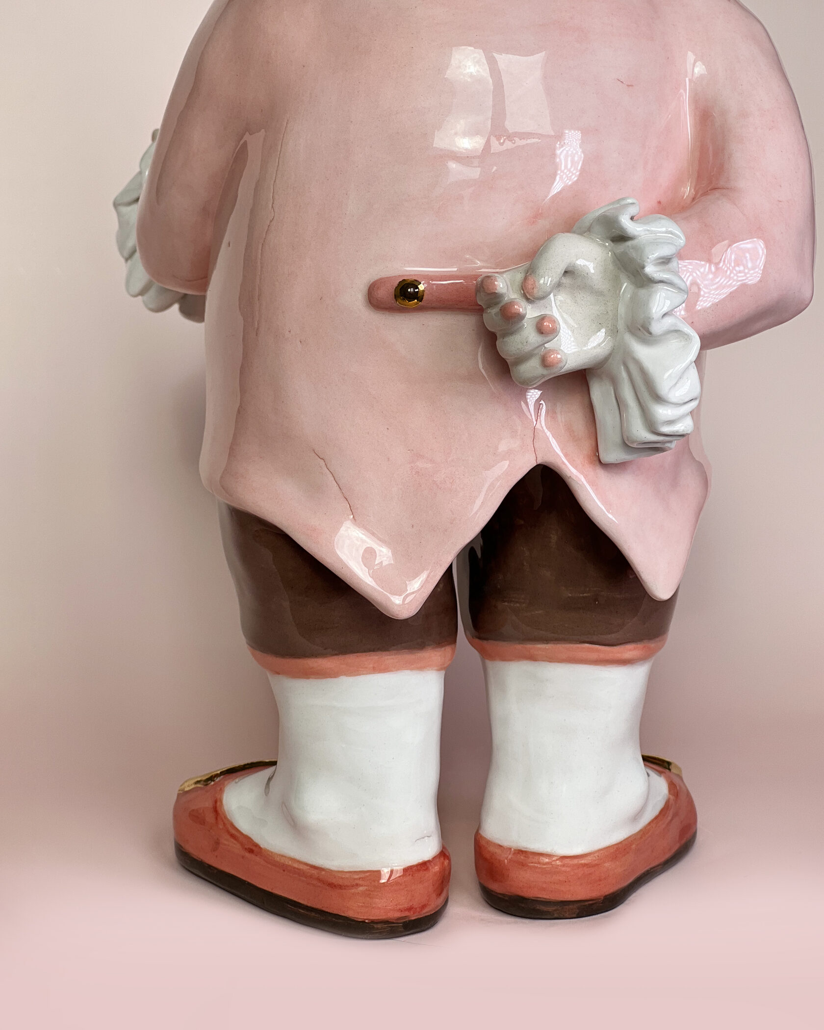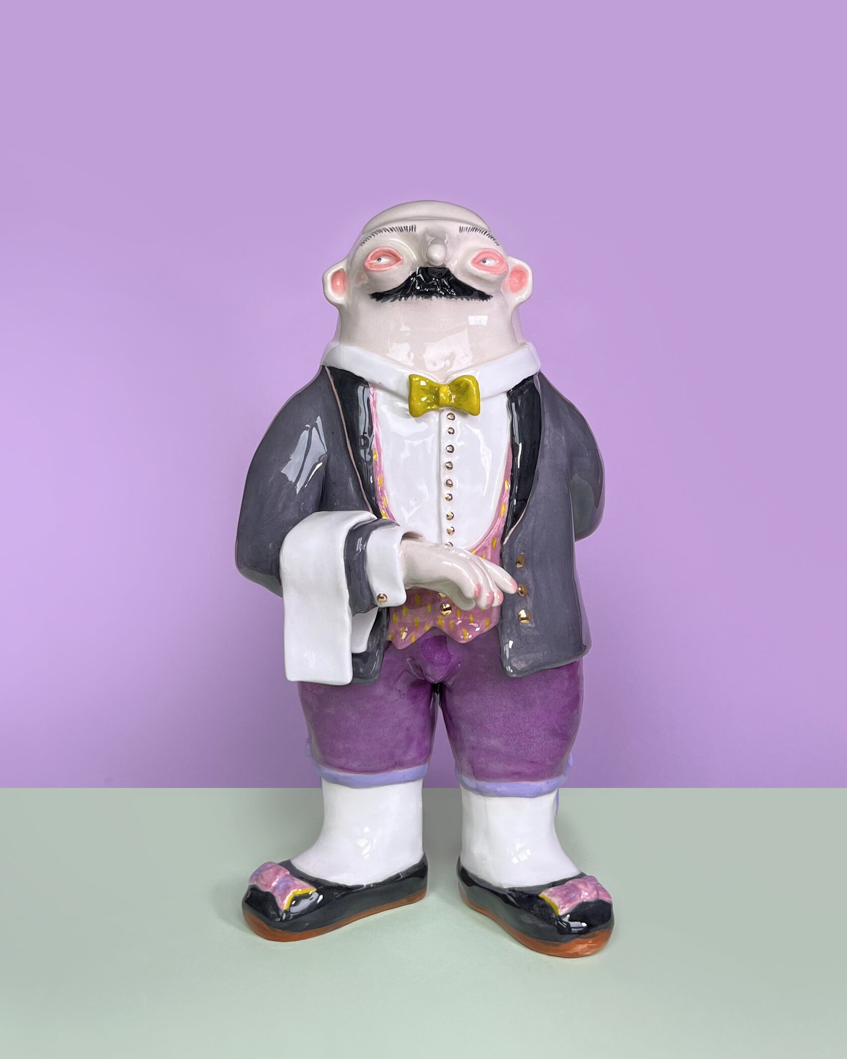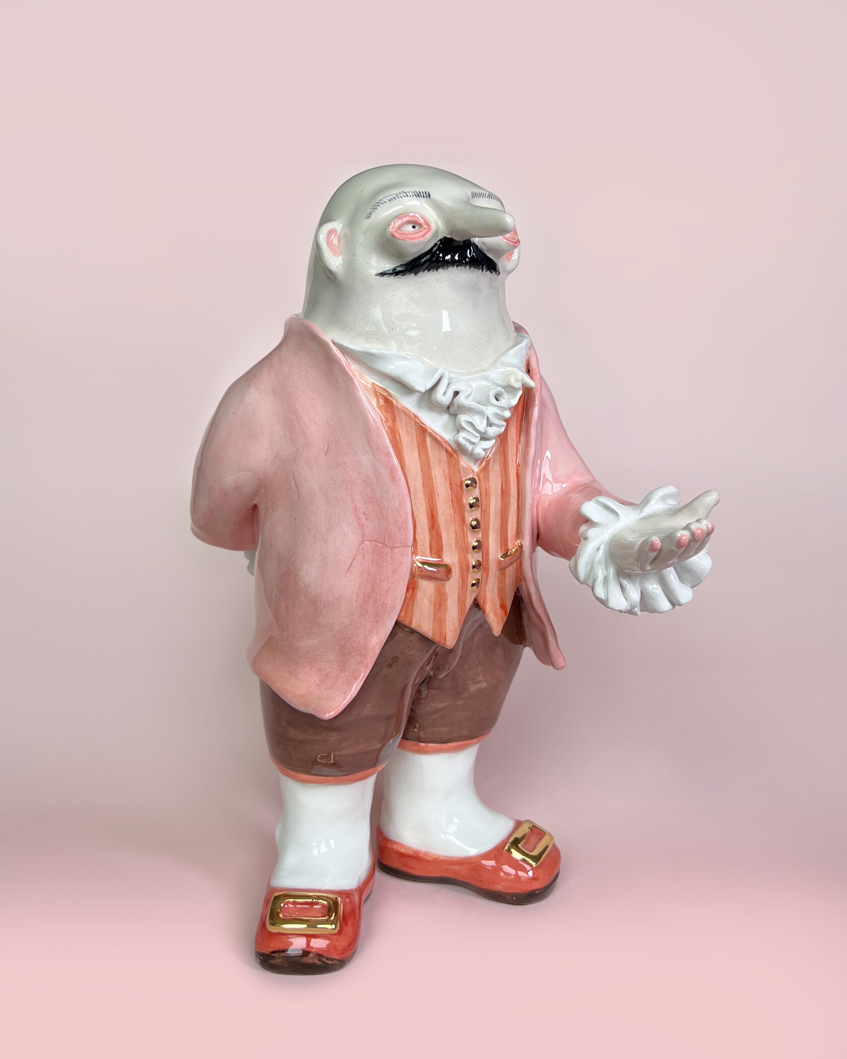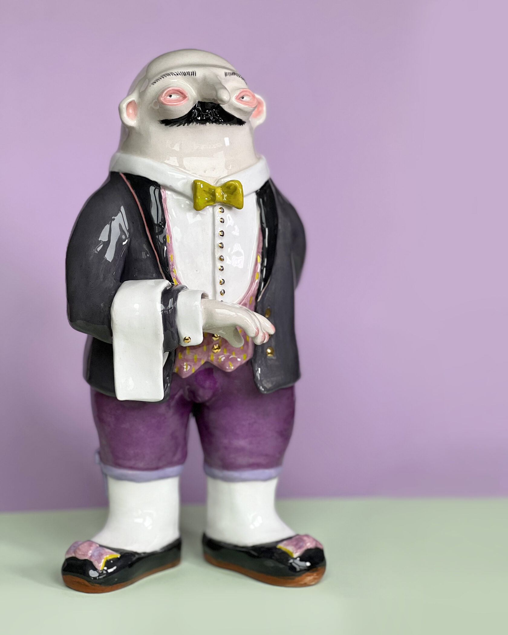 ENG Ver is the eldest son Ver inherited his mother's hues: his costume almost matched Eila's pink outfit, as if he wanted to be her reflection. He is the guardian of words and truth, the truth that was spoken but remained unheard. With his left hand, he extends an invisible promise, while his right hand is hidden behind his back. This gesture represents power and concealment. Eila loved him more than the others, and this love became a burden for Ver: he always stood taller, but never freer. Height (H): 27 cm Width (W): 14 cm
