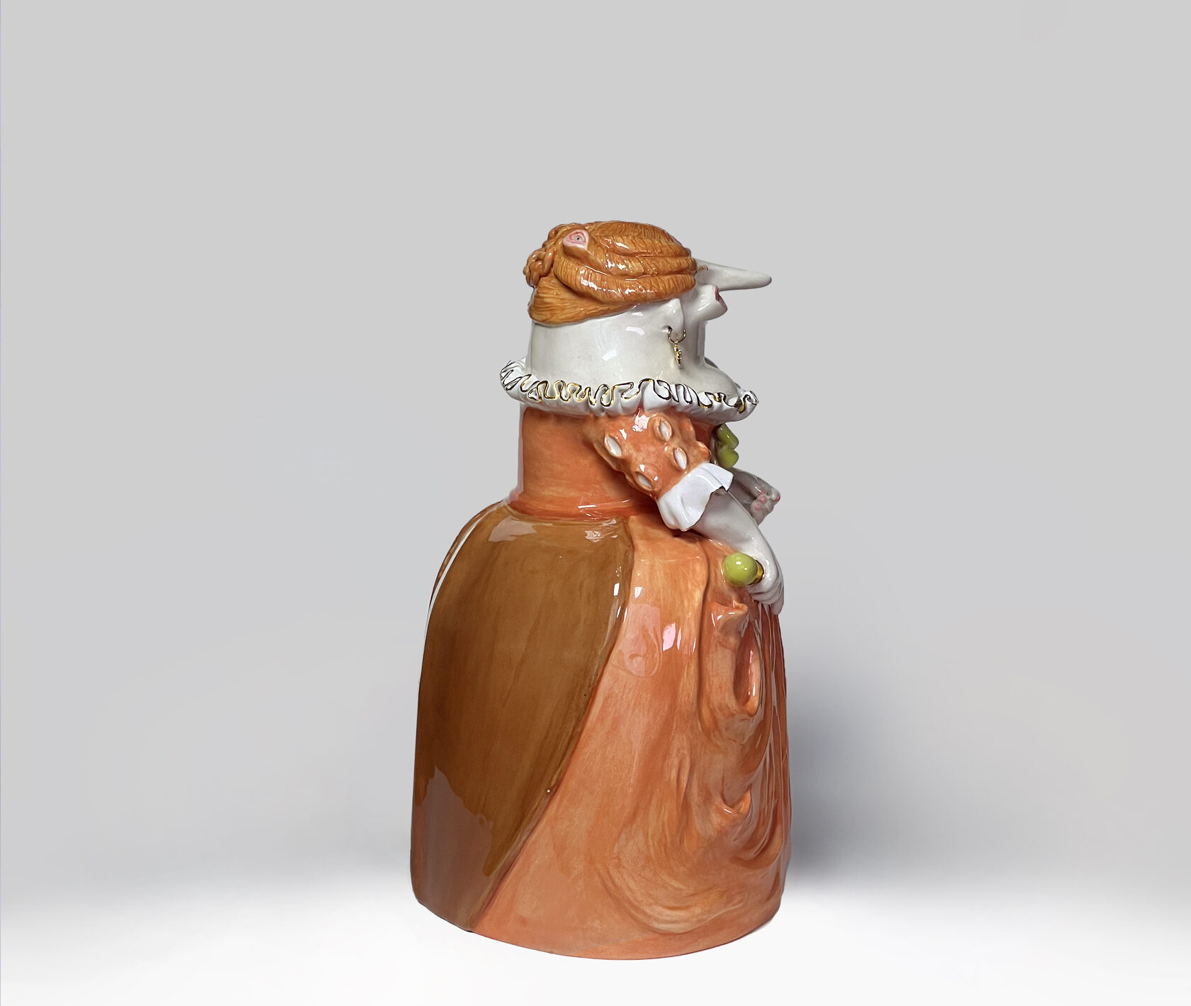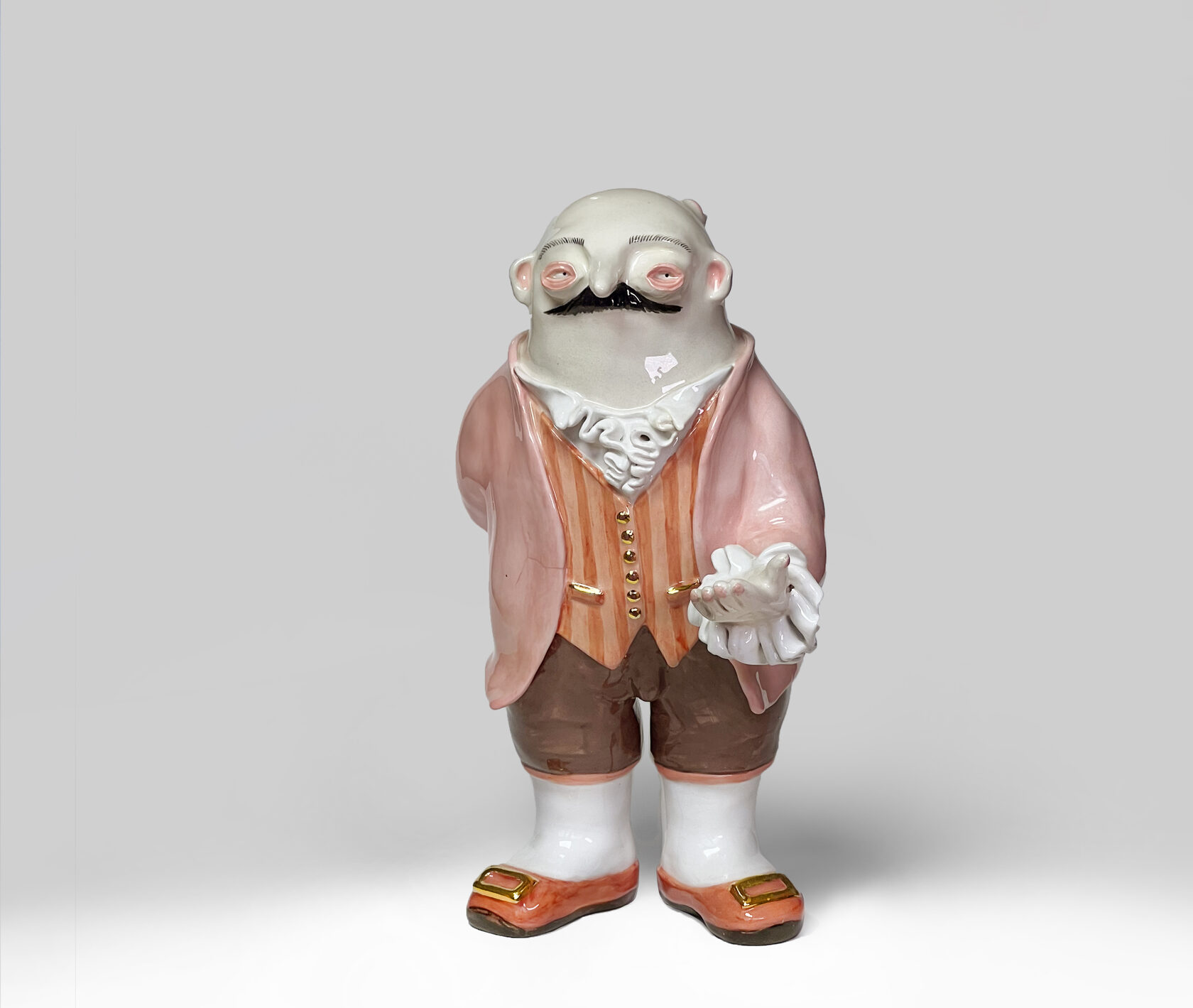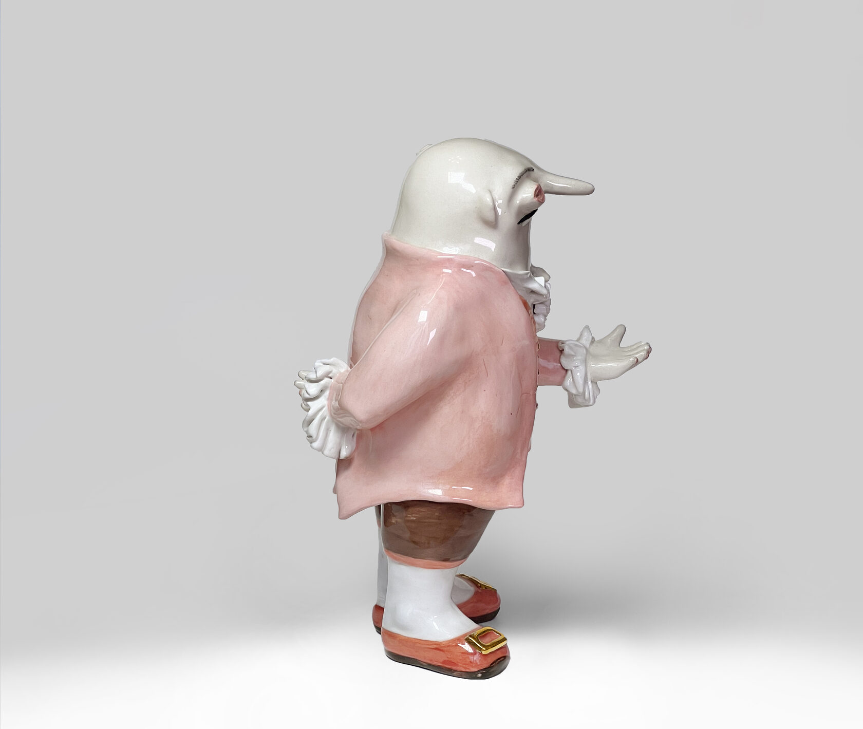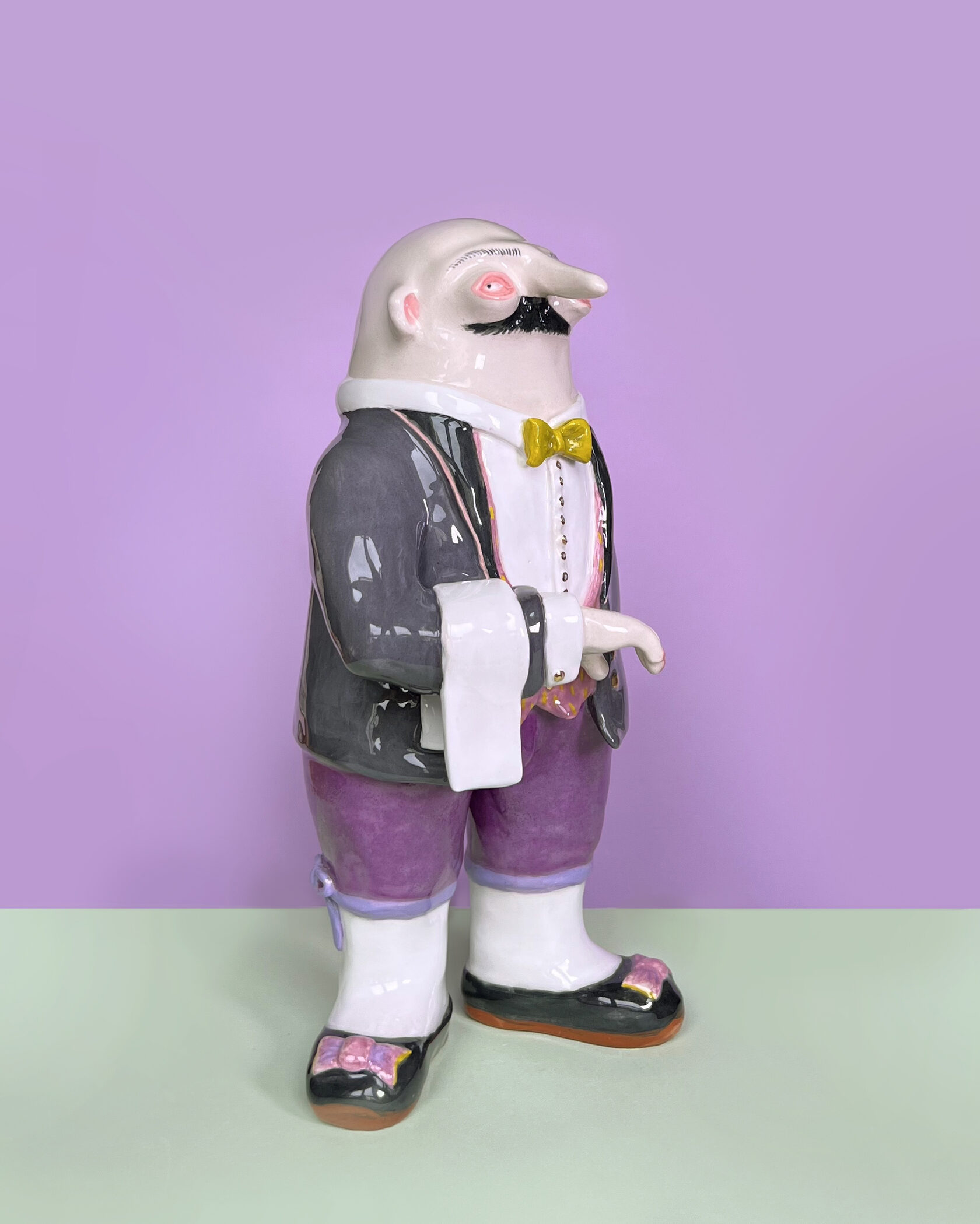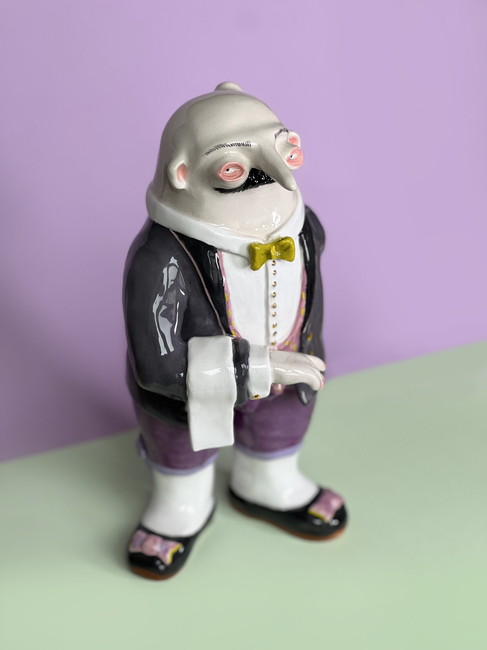 ENG Ver is the eldest son Ver inherited his mother's hues: his costume almost matched Eila's pink outfit, as if he wanted to be her reflection. He is the guardian of words and truth, the truth that was spoken but remained unheard. With his left hand, he extends an invisible promise, while his right hand is hidden behind his back. This gesture represents power and concealment. Eila loved him more than the others, and this love became a burden for Ver: he always stood taller, but never freer. Height (H): 27 cm Width (W): 14 cm