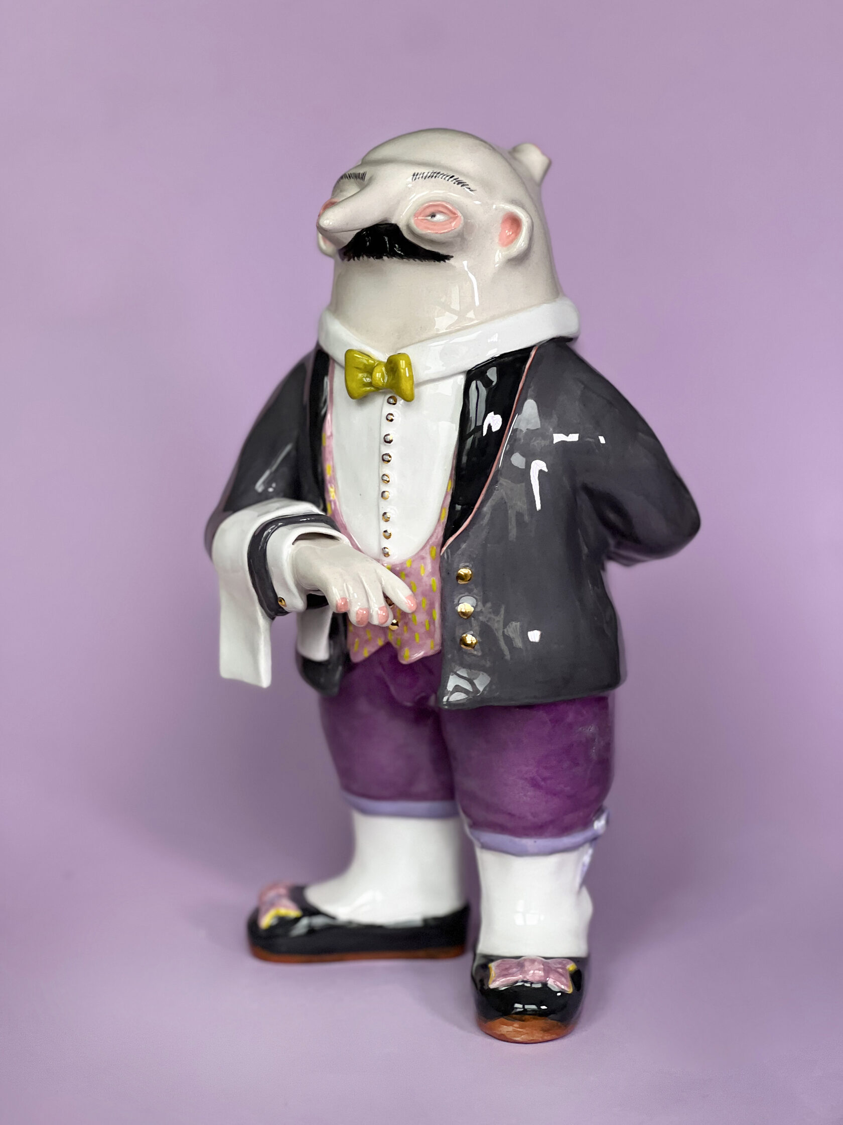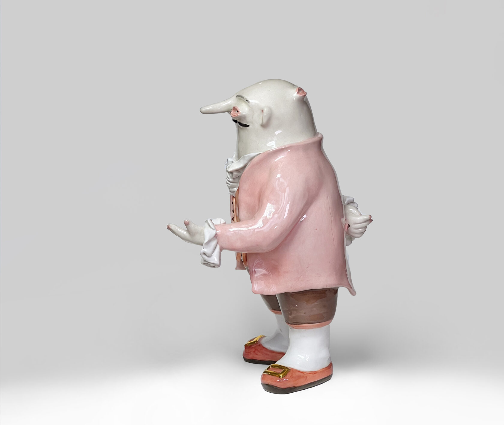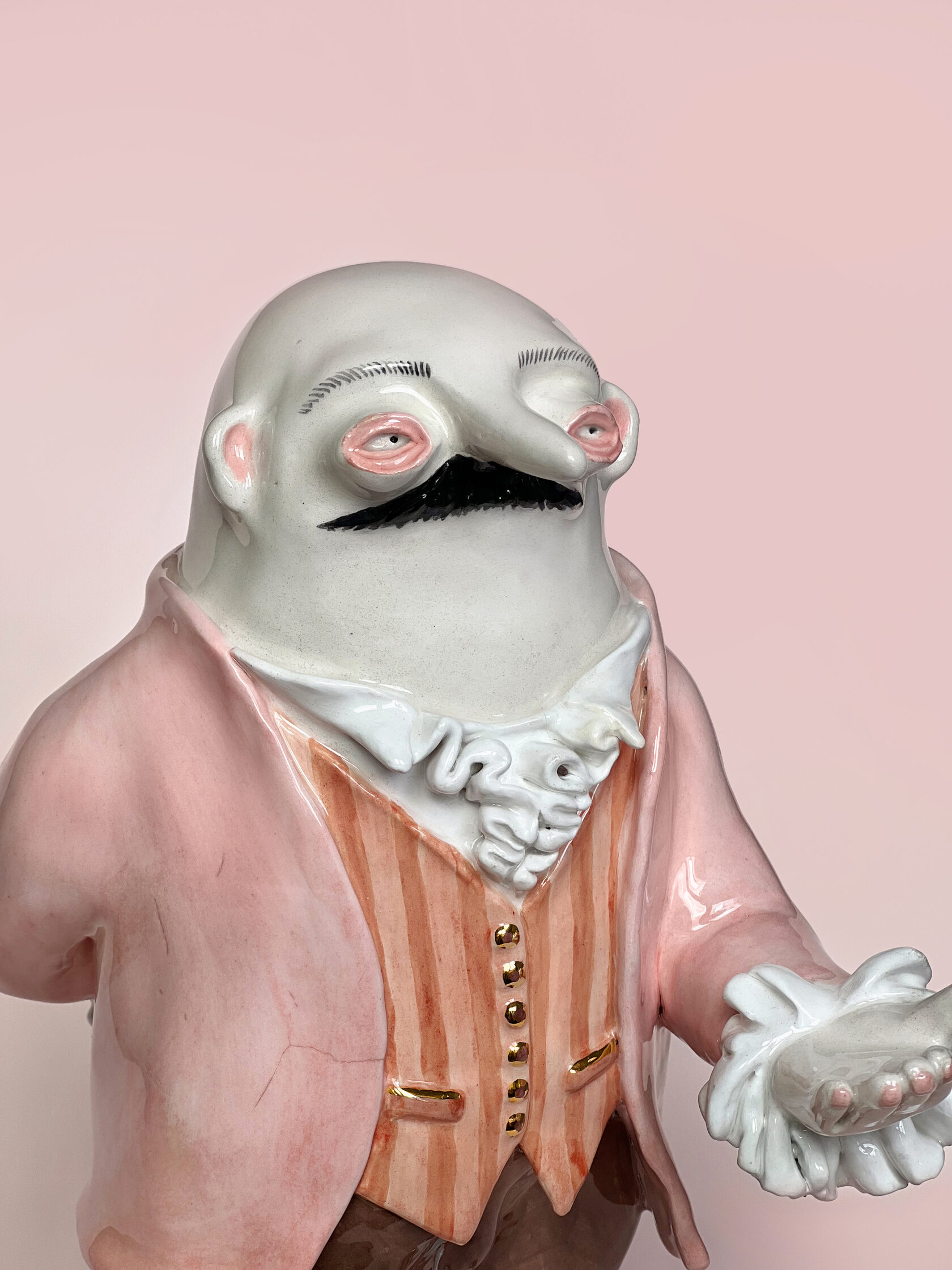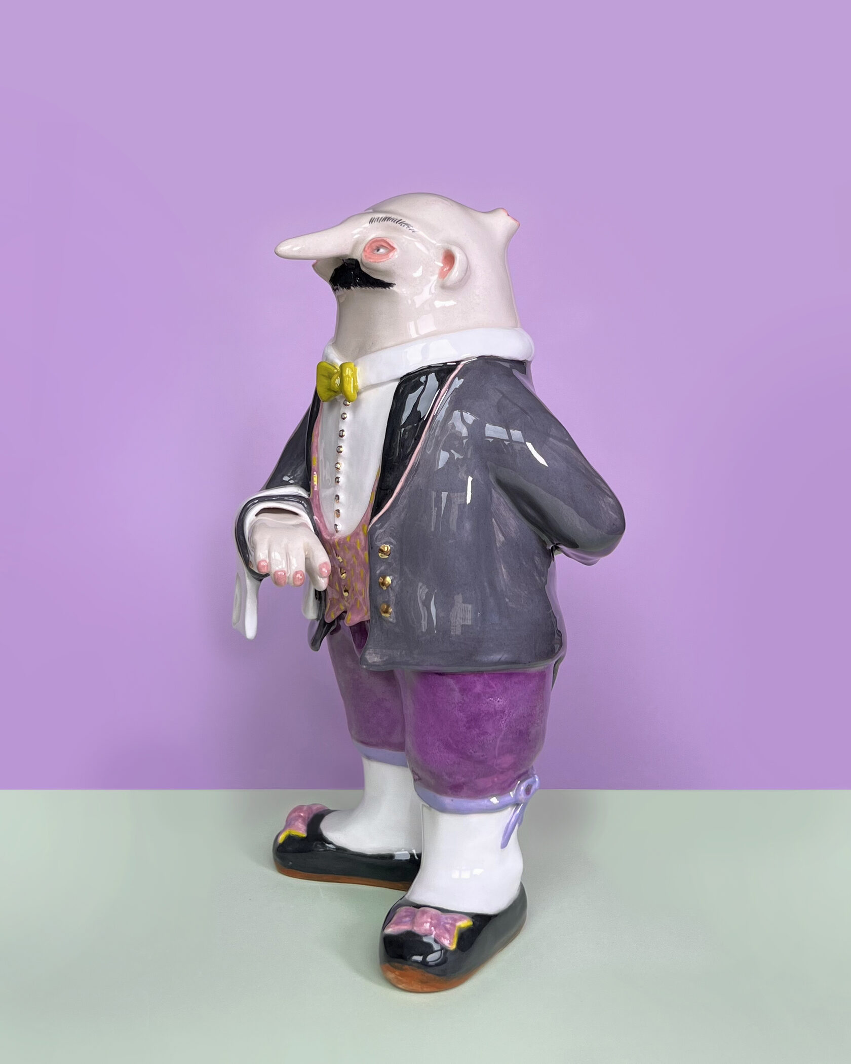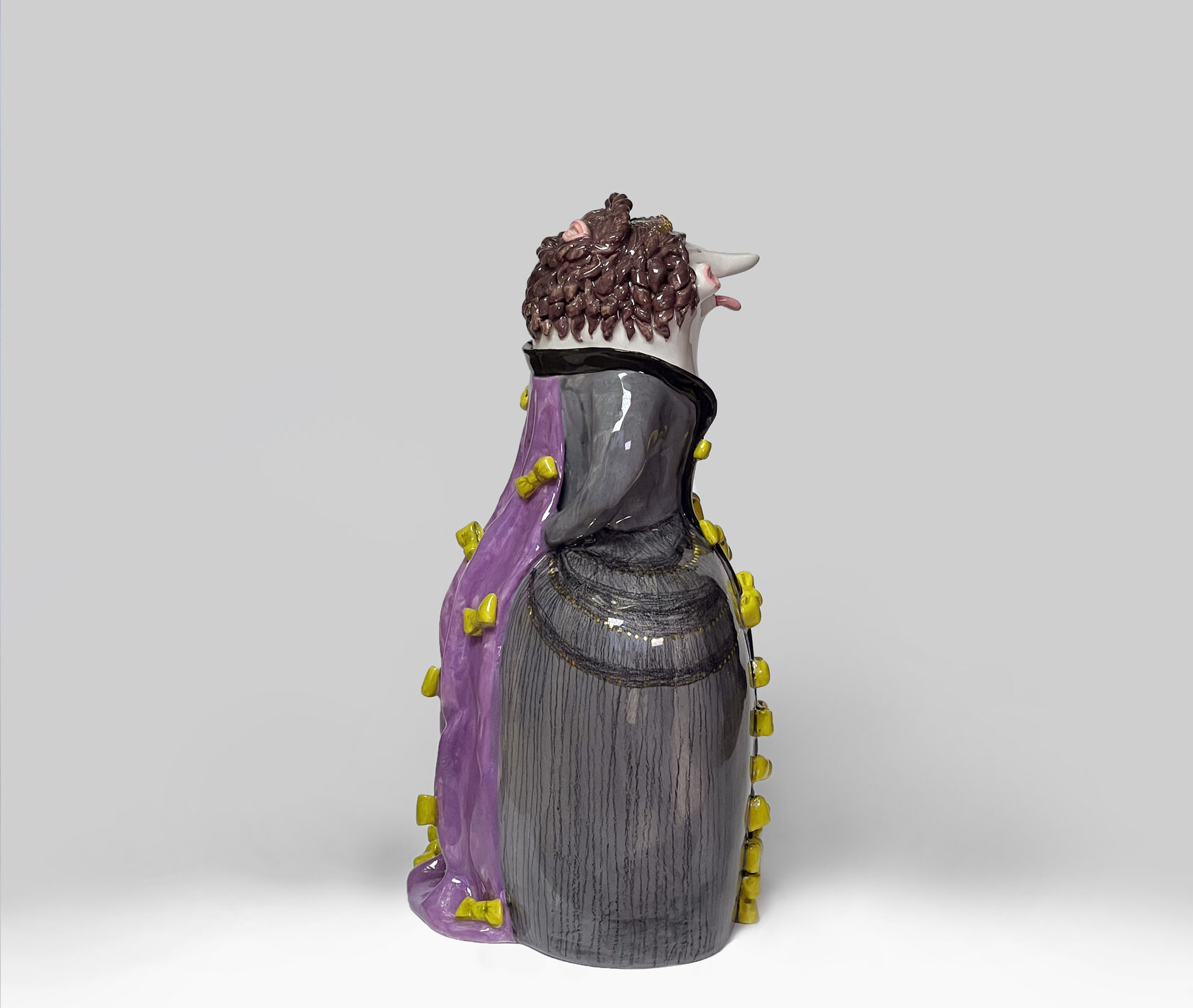 ENG Ver is the eldest son Ver inherited his mother's hues: his costume almost matched Eila's pink outfit, as if he wanted to be her reflection. He is the guardian of words and truth, the truth that was spoken but remained unheard. With his left hand, he extends an invisible promise, while his right hand is hidden behind his back. This gesture represents power and concealment. Eila loved him more than the others, and this love became a burden for Ver: he always stood taller, but never freer. Height (H): 27 cm Width (W): 14 cm
