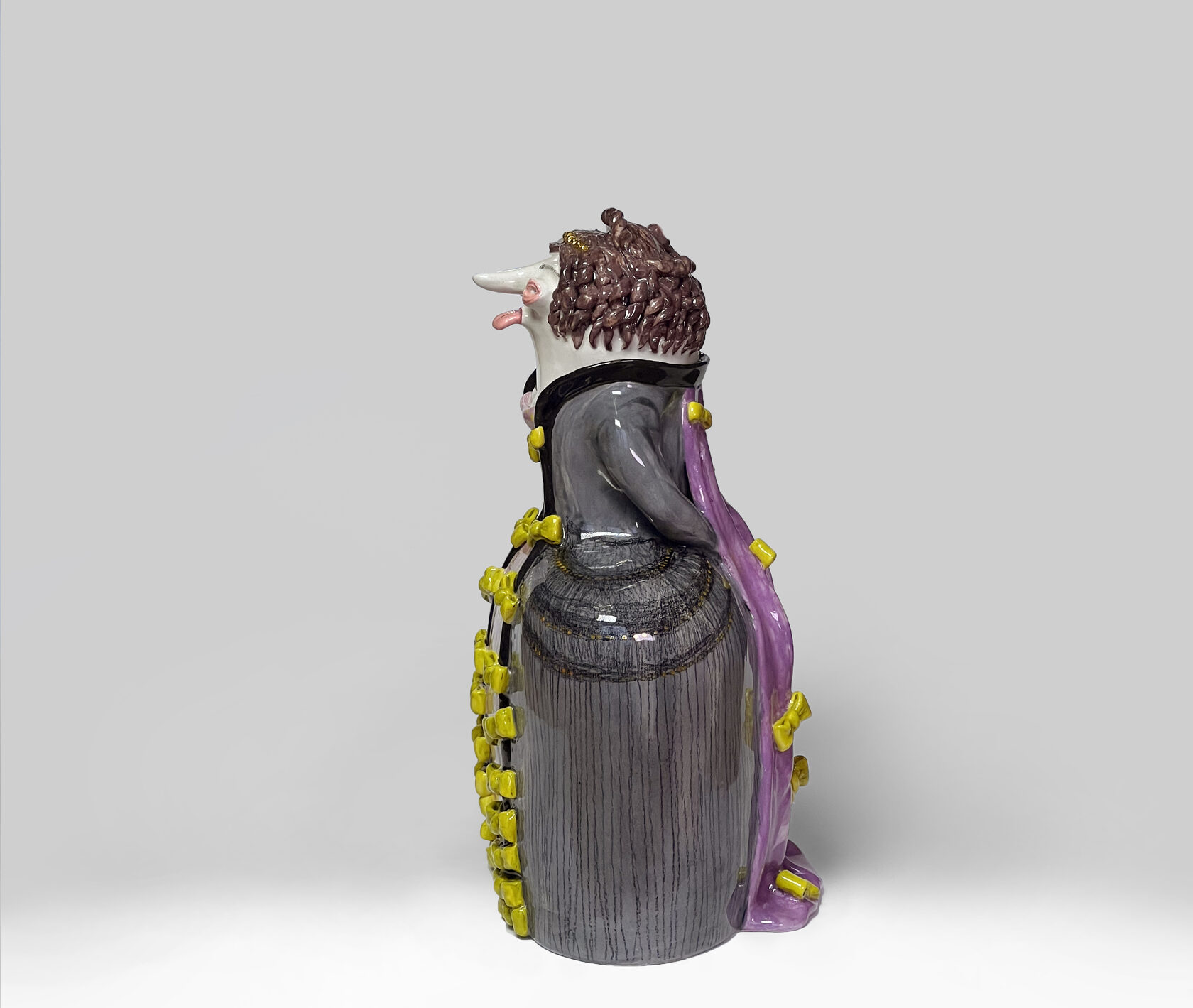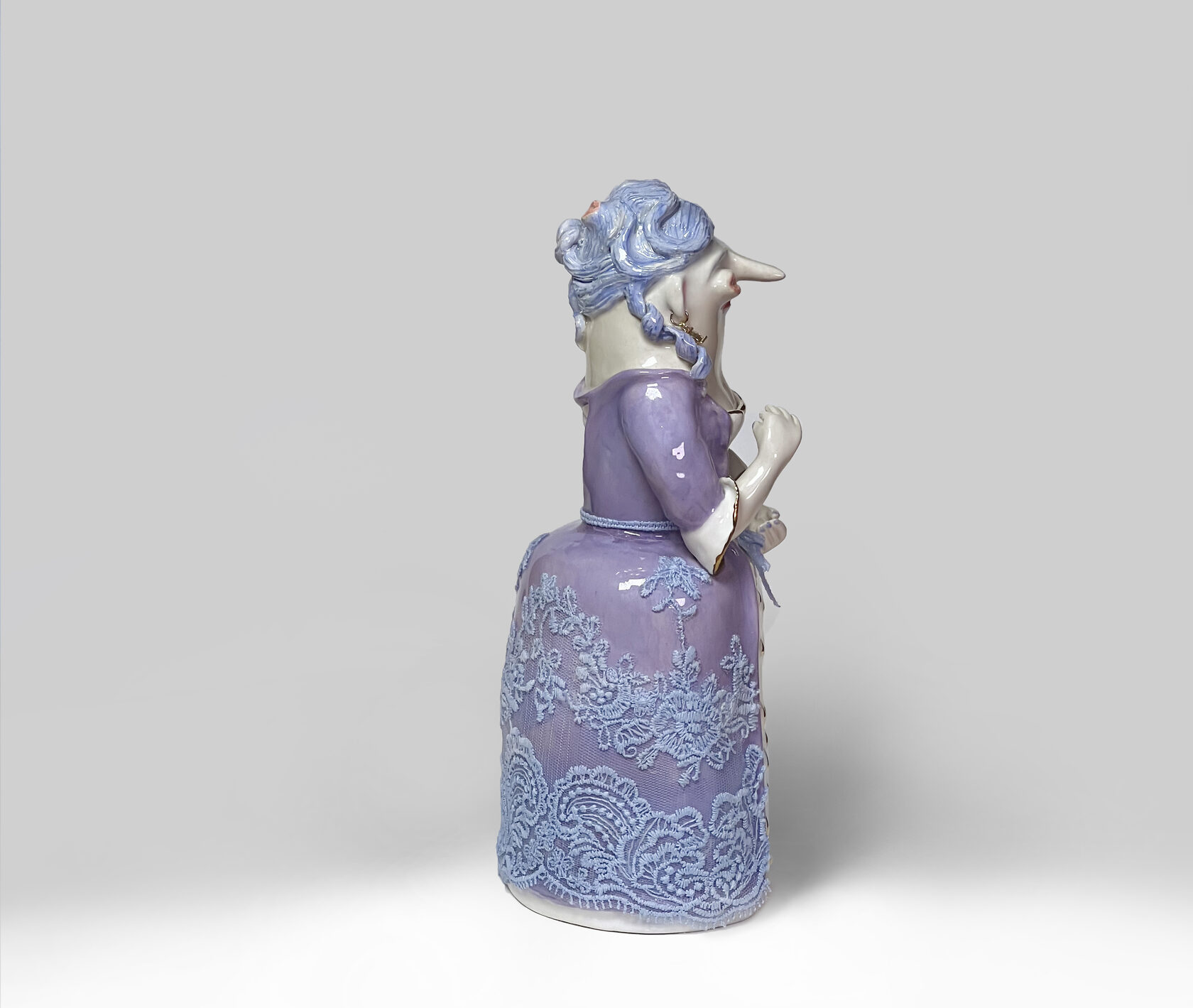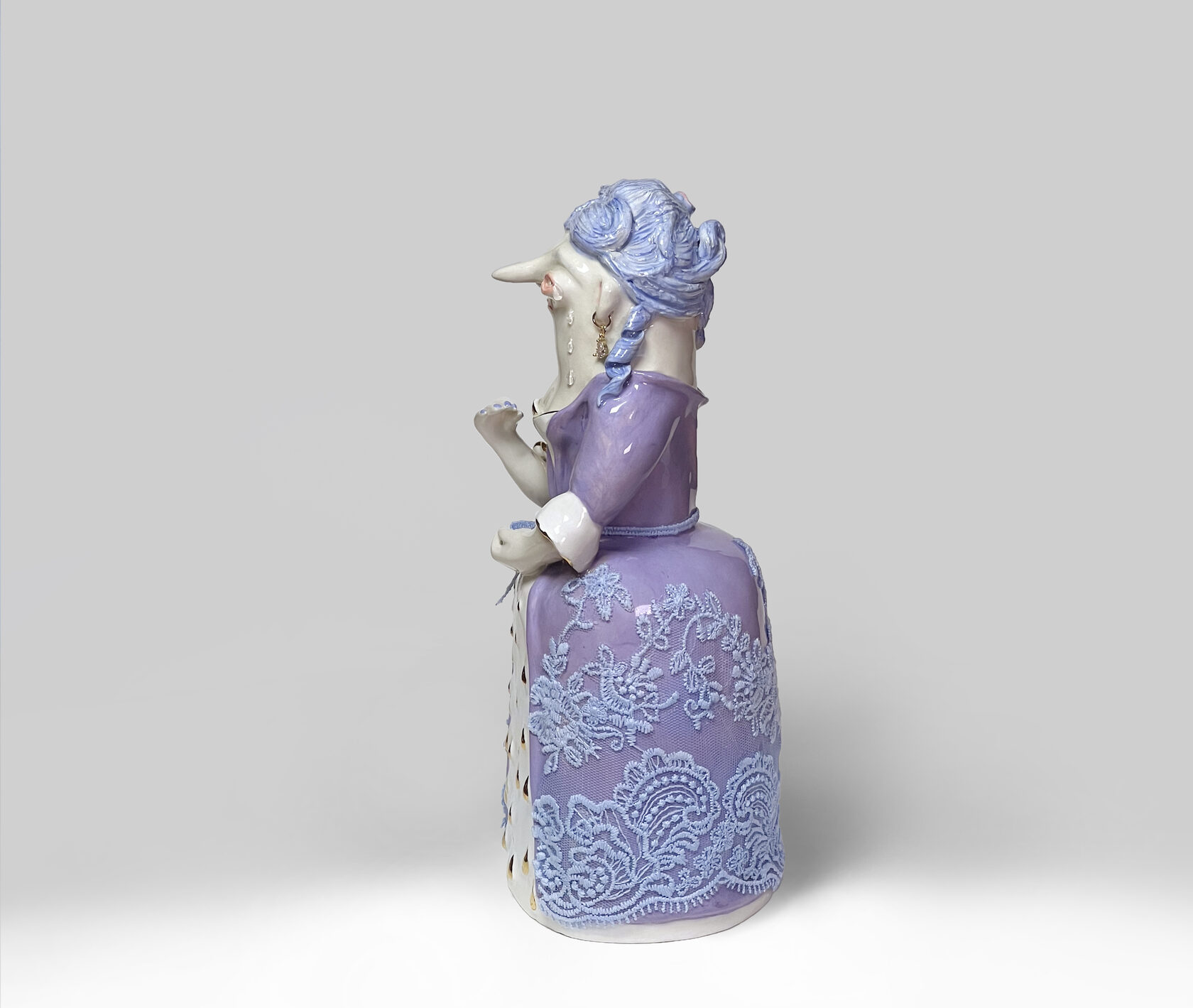 ENG Neri is Eila's youngest son, born in the shadow of his mother and brother. His image holds the tears of others: an elongated neck, a gaze filled with unspeakable sadness. He is a guardian of feelings. In his right hand, at his bent elbow, he holds a white handkerchief—always ready to wipe away the tears of others, but not his own. His silence contains the pain and empathy he bears for others. Neri is the quiet opposite of Ver, a reminder that vulnerability also has strength. Height (H): 26 cm Width (W): 14 cm