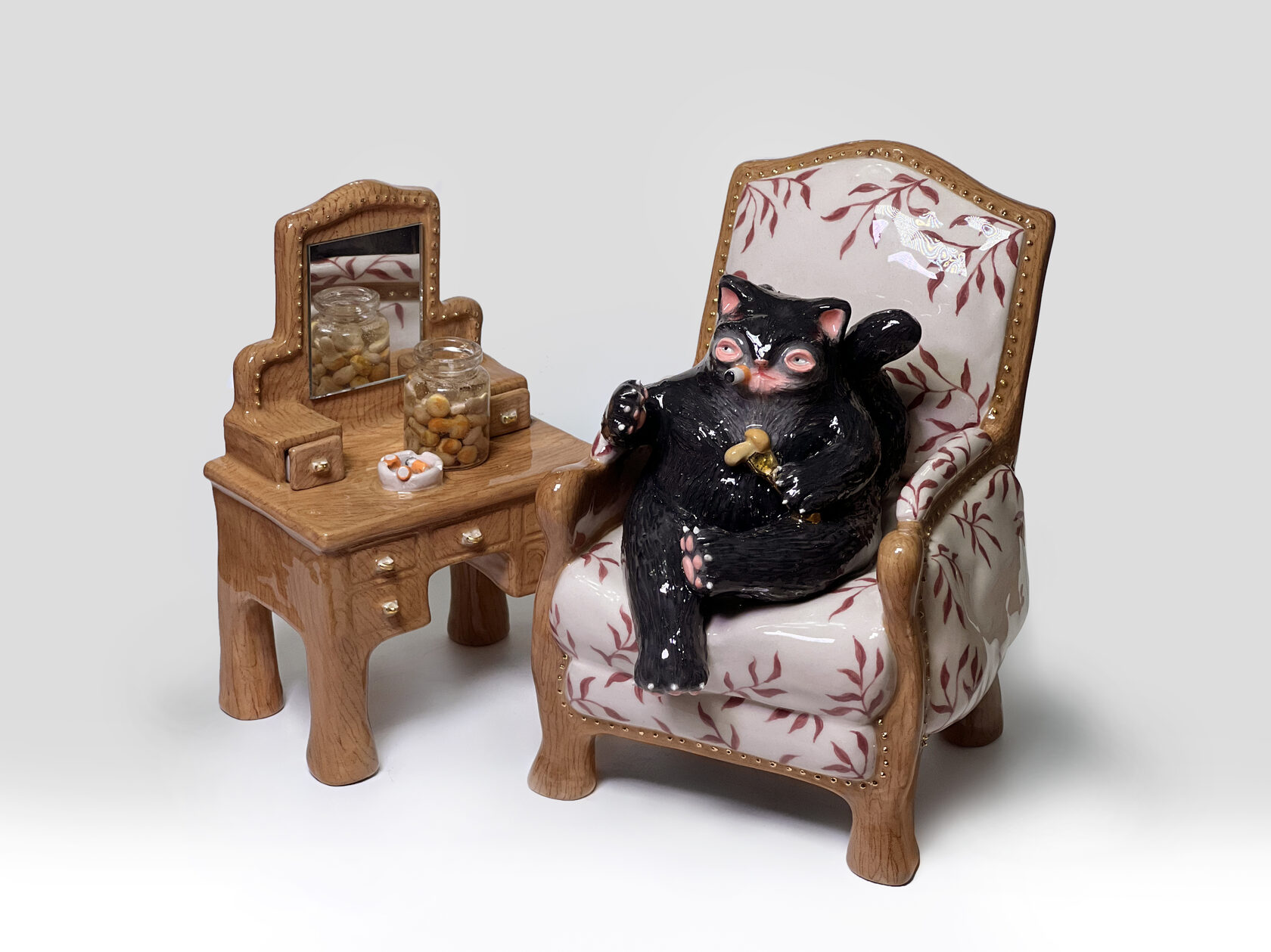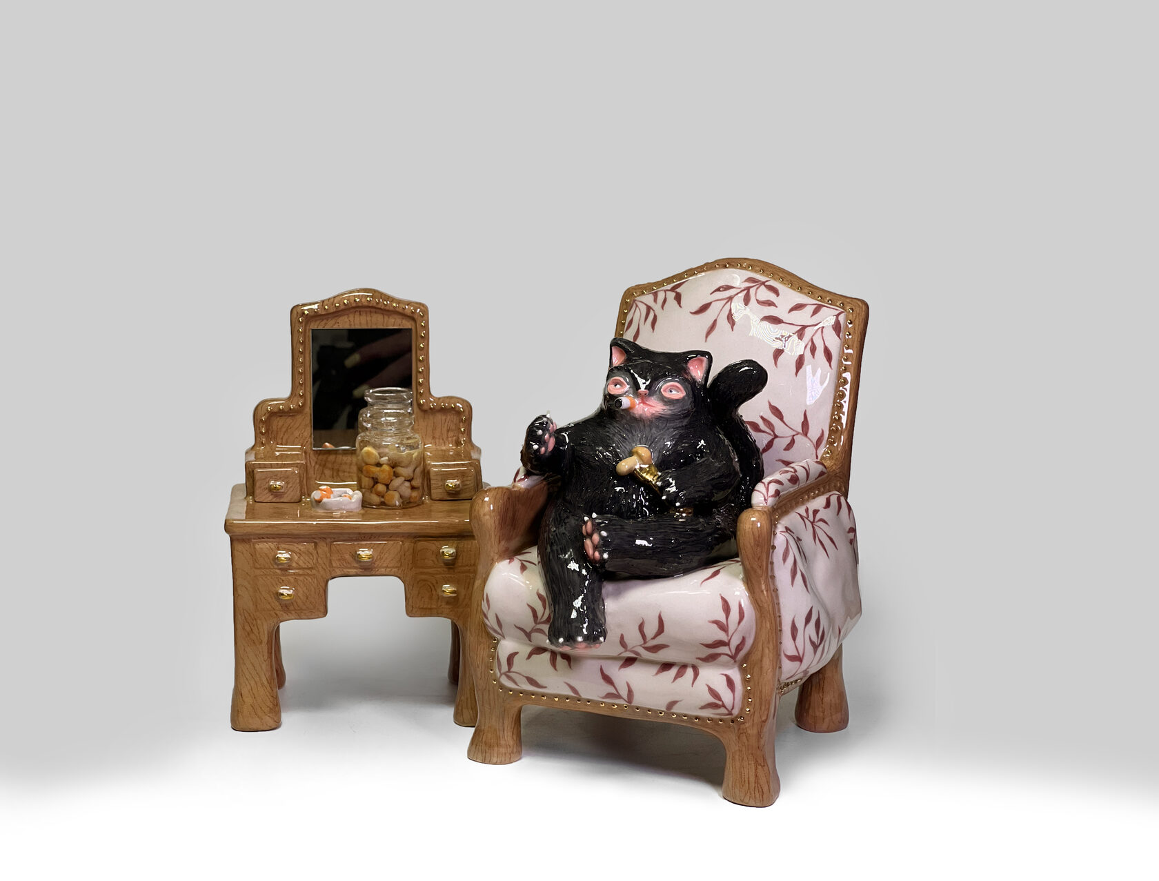 Четвертый Кот Бегемот из серии “Мастер и Маргарита” создан российской художницей Алисой Воск в 2025 году. Кот восседает в массивном старинном кресле, раскинувшись в позе истинного гедониста. В зубах — дымящаяся сигарета, он ни о чем не переживает, ведь он на стороне тьмы. Его усмешка полна лукавства, а взгляд — искрящейся иронии. В этот раз , как на страницах романа, маринованные грибочки. В кресле тоже захотелось классики, оно стало чуть больше, а ещё — впервые — я решила добавить рельефности дерева. Height (H): 28 cm Width (W): 28 cm