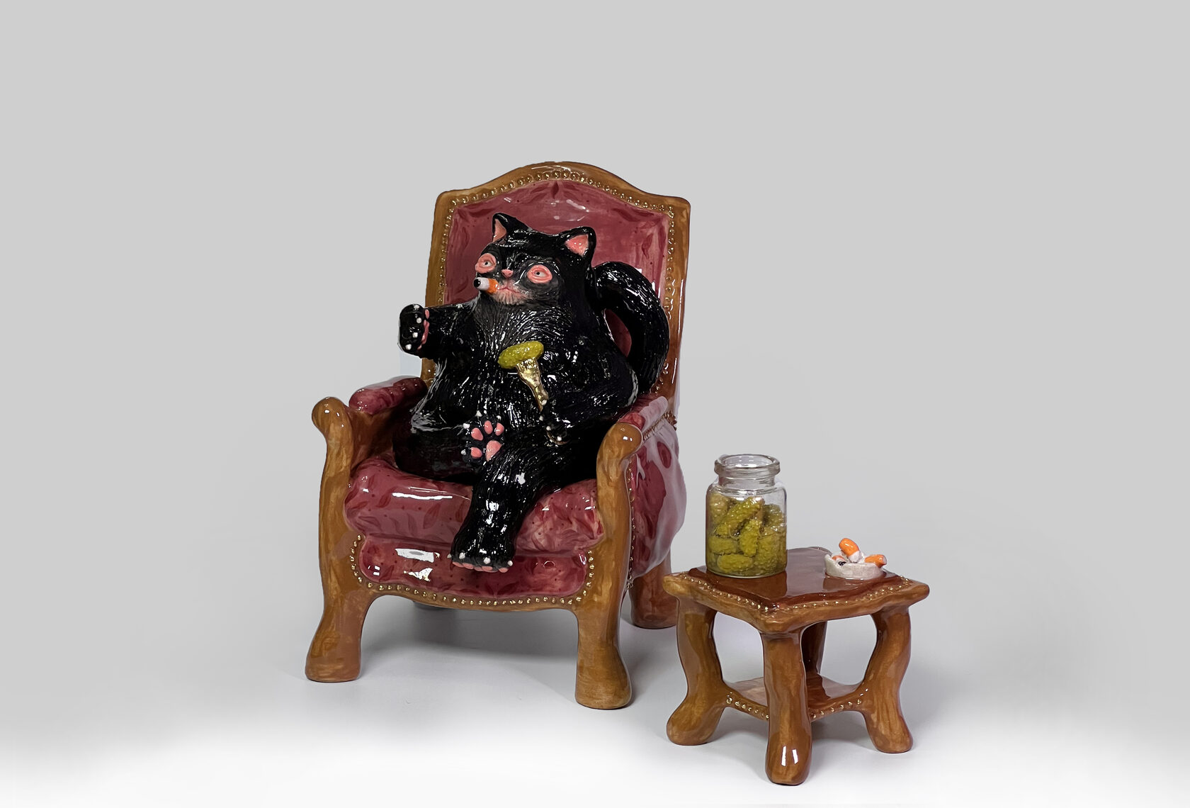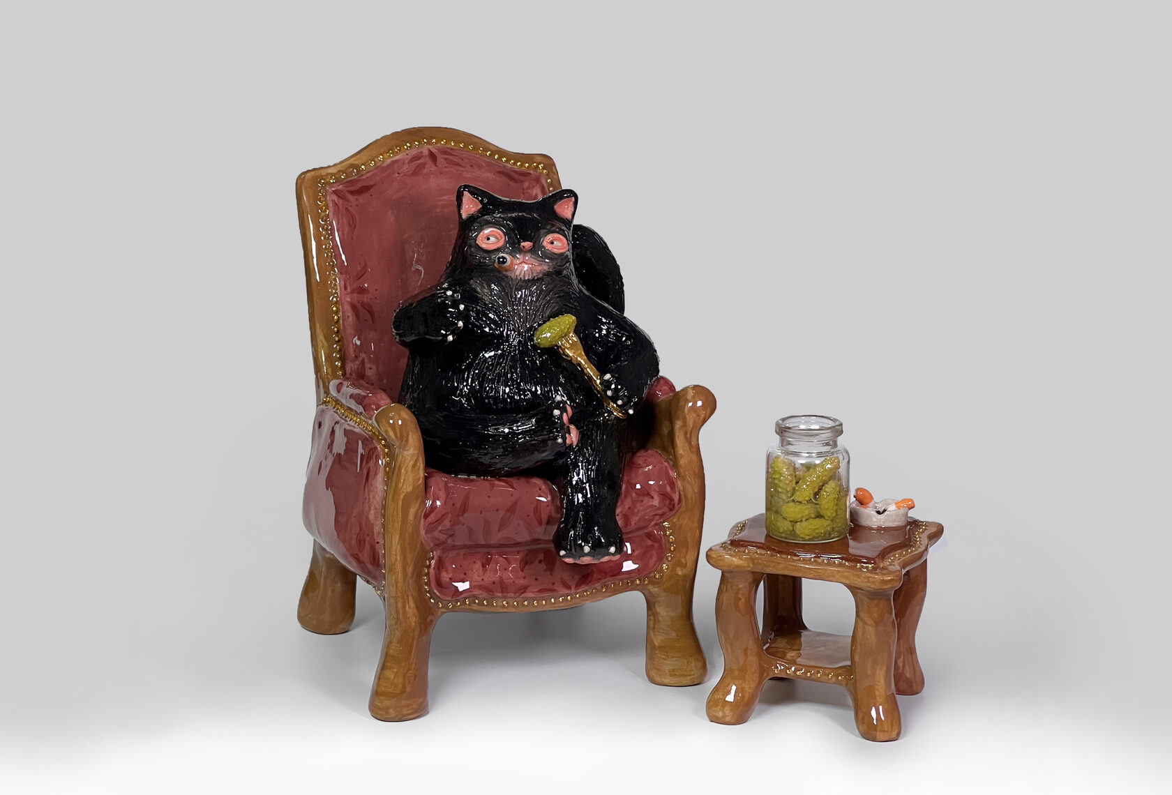 Кот Бегемот из серии “Мастер и Маргарита” создан российской художницей Алисой Воск в 2025 году. Кот восседает в массивном старинном кресле, раскинувшись в позе истинного гедониста. Рядом на столике банка с маринованными огурцами. В зубах — дымящаяся сигарета, он ни о чем не переживает, ведь он на стороне тьмы. Его усмешка полна лукавства, а взгляд — искрящейся иронии.
